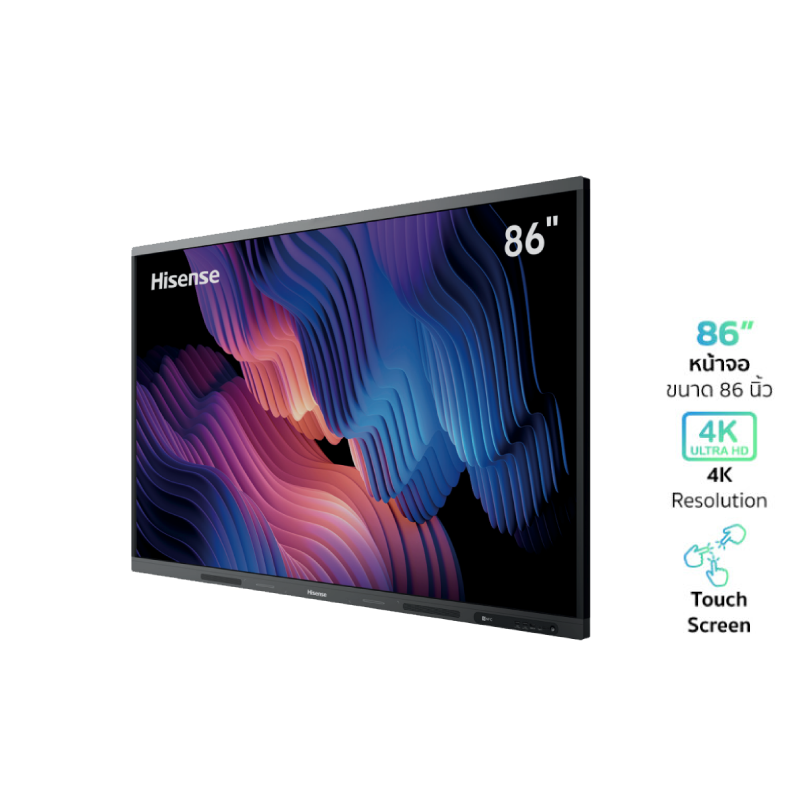 HISENSE 86MR6DE-E จออินเตอร์แอคทีฟขนาดใหญ่ 86 นิ้ว ความละเอียด 4K Ultra HD (3,840 x 2,160 พิกเซล) มอบภาพคมชัด สีสันสดใส รองรับการใช้งานในห้องประชุม ห้องเรียน และห้องสัมมนาขนาดใหญ่