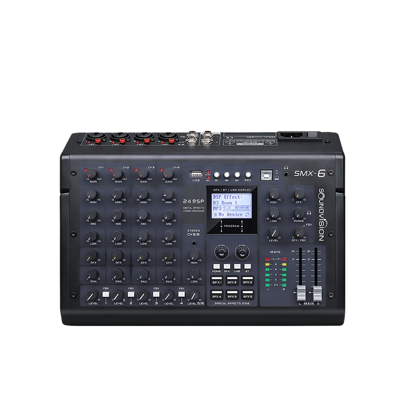 มิกเซอร์ อนาล็อก SOUNDVISION SMX-6 ระดับมืออาชีพ 8 ชาแนล ใช้พลังงาน phantom 48V ในแต่ละชาแนล มีเอฟเฟกต์พิเศษ 6 แบบ ความละเอียด 24 bit จากแบรนด์ SOUNDVISION